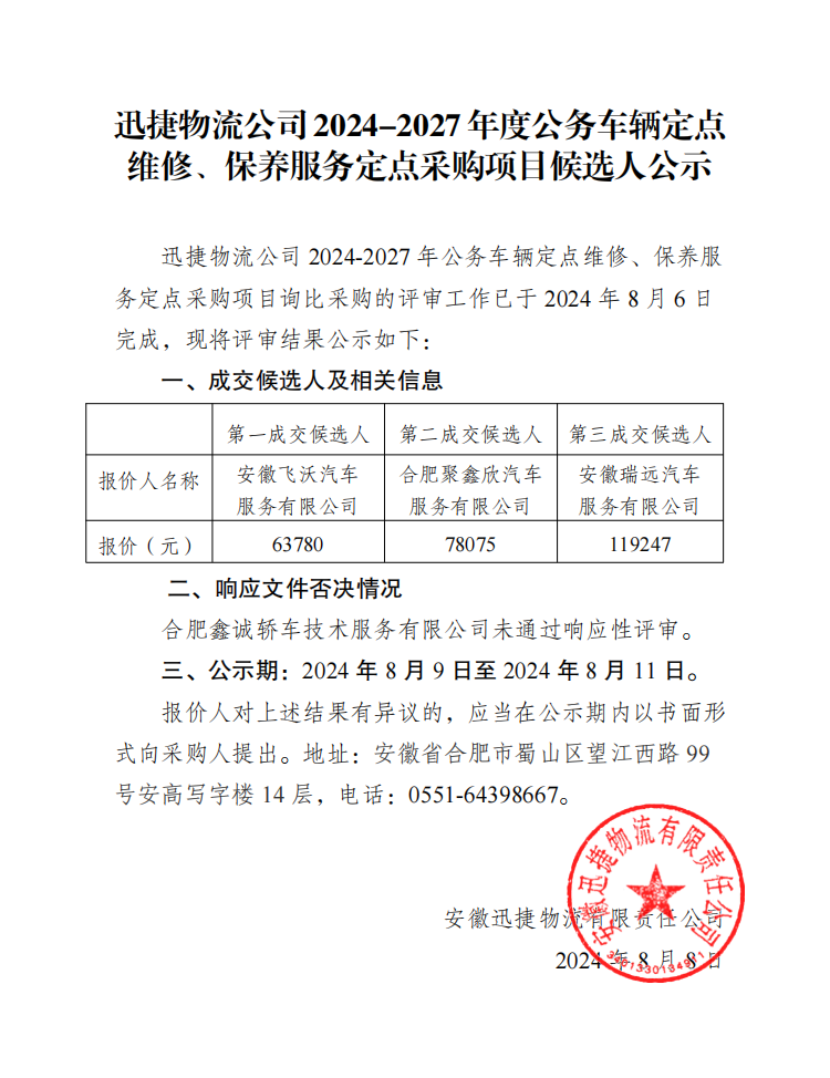 2024-2027年度公务车辆定点维修、保养服务定点采购项目候选人公示