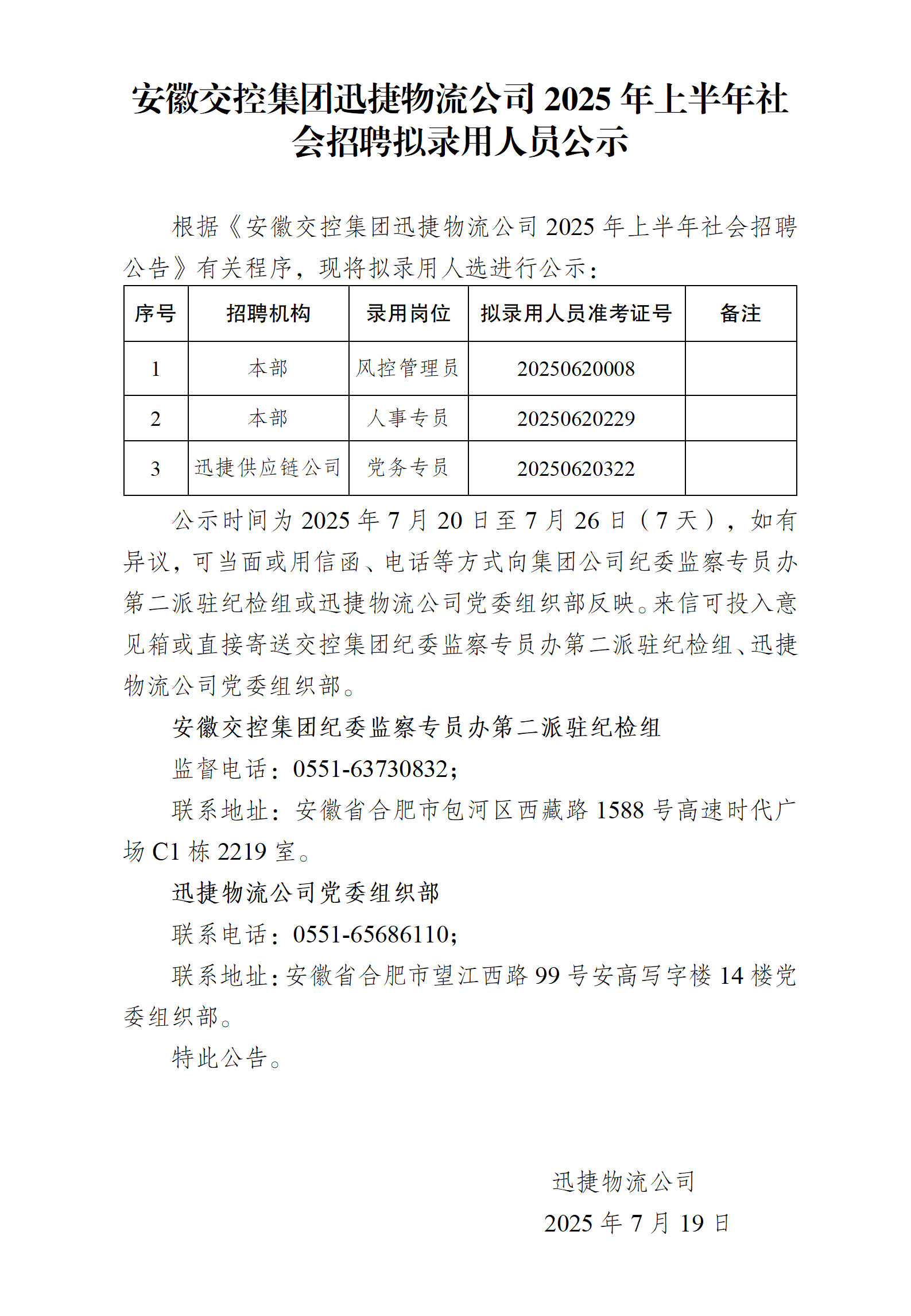 安徽交控集团迅捷物流公司2025年上半年社会招聘拟录用人员公示