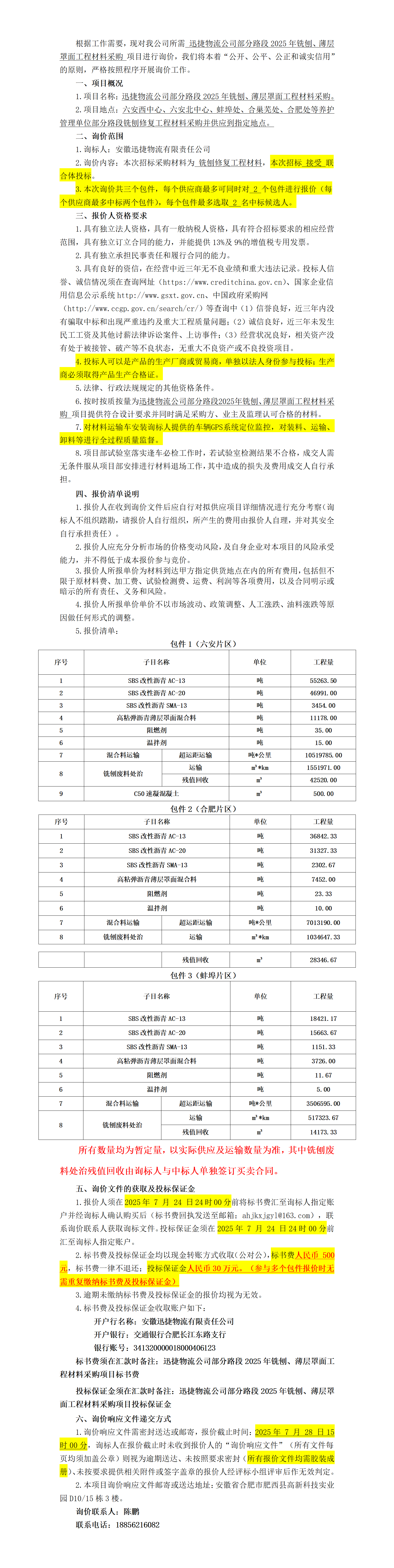 迅捷物流公司部分路段2025年铣刨、薄层罩面工程材料采购项目询价公告