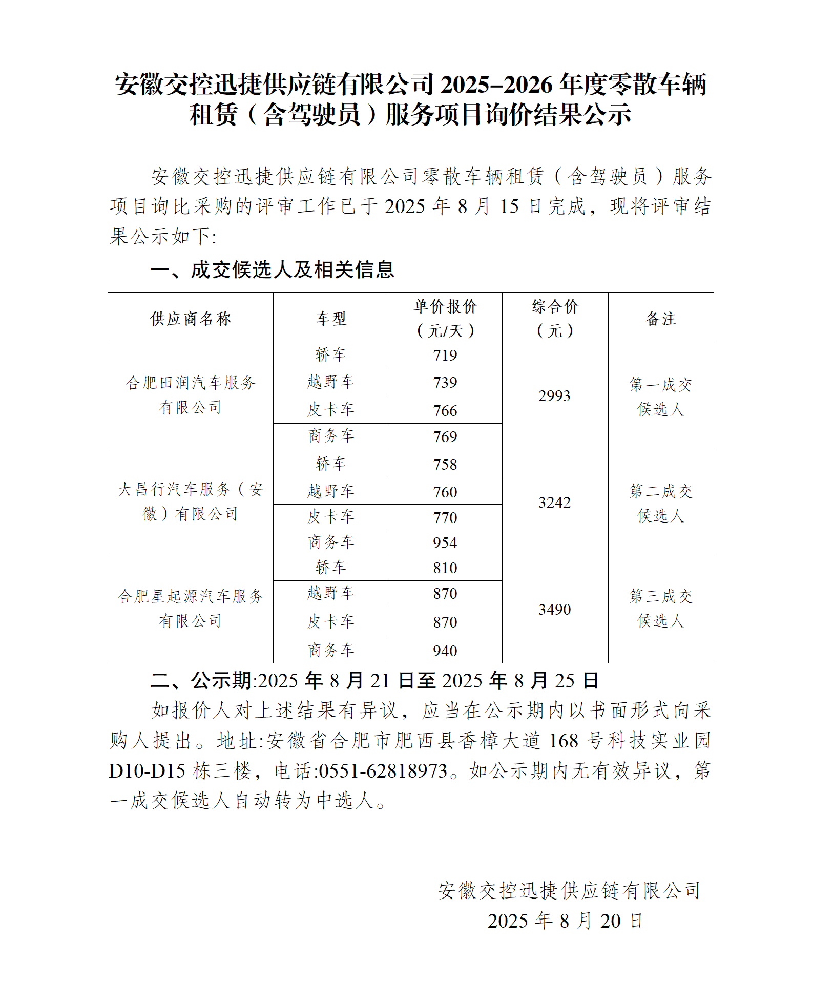 安徽交控迅捷供应链有限公司2025-2026年度零散车辆租赁(含驾驶员)服务项目询价结果公示