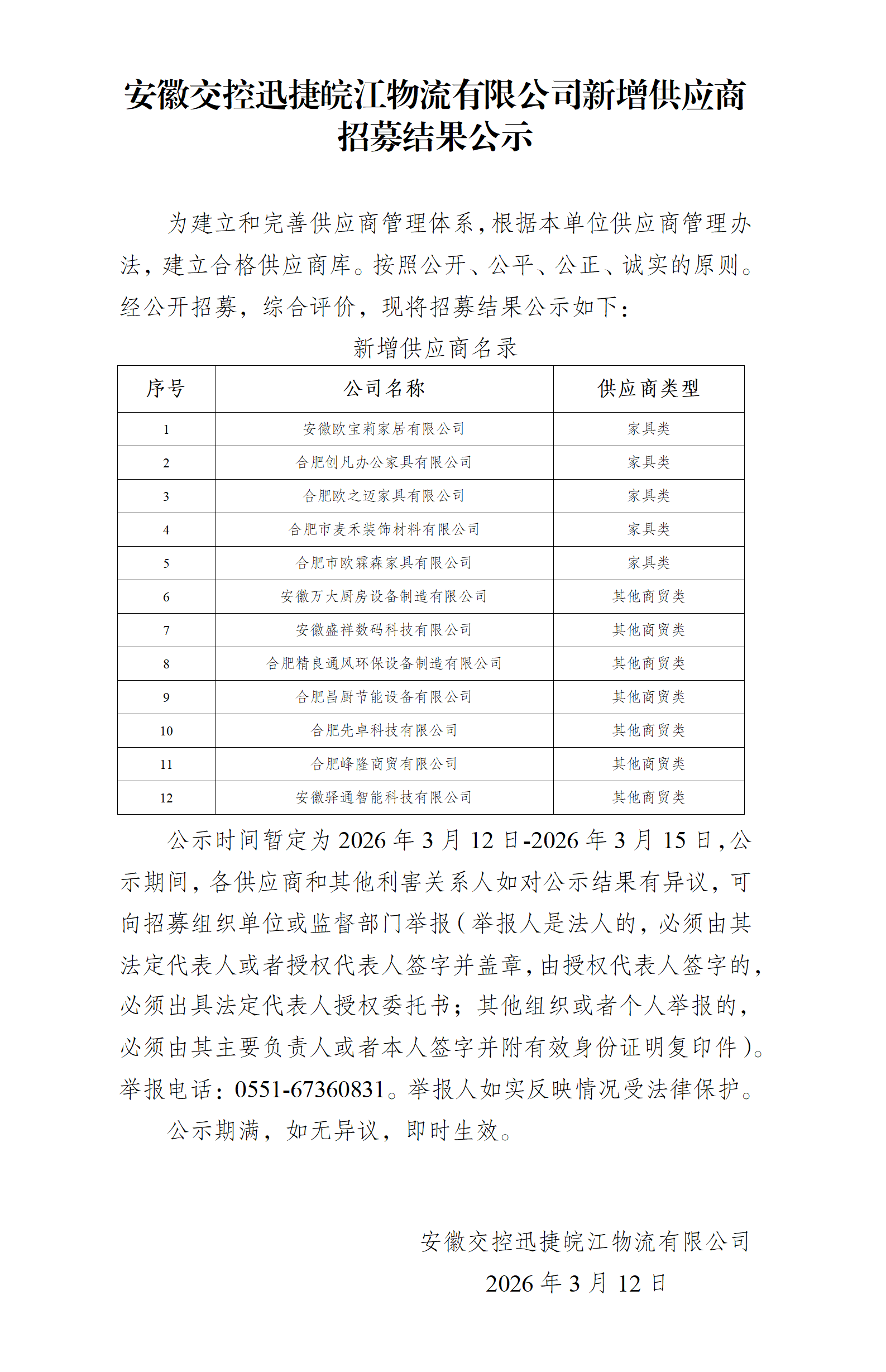 安徽交控迅捷皖江物流有限公司新增供应商招募结果公示